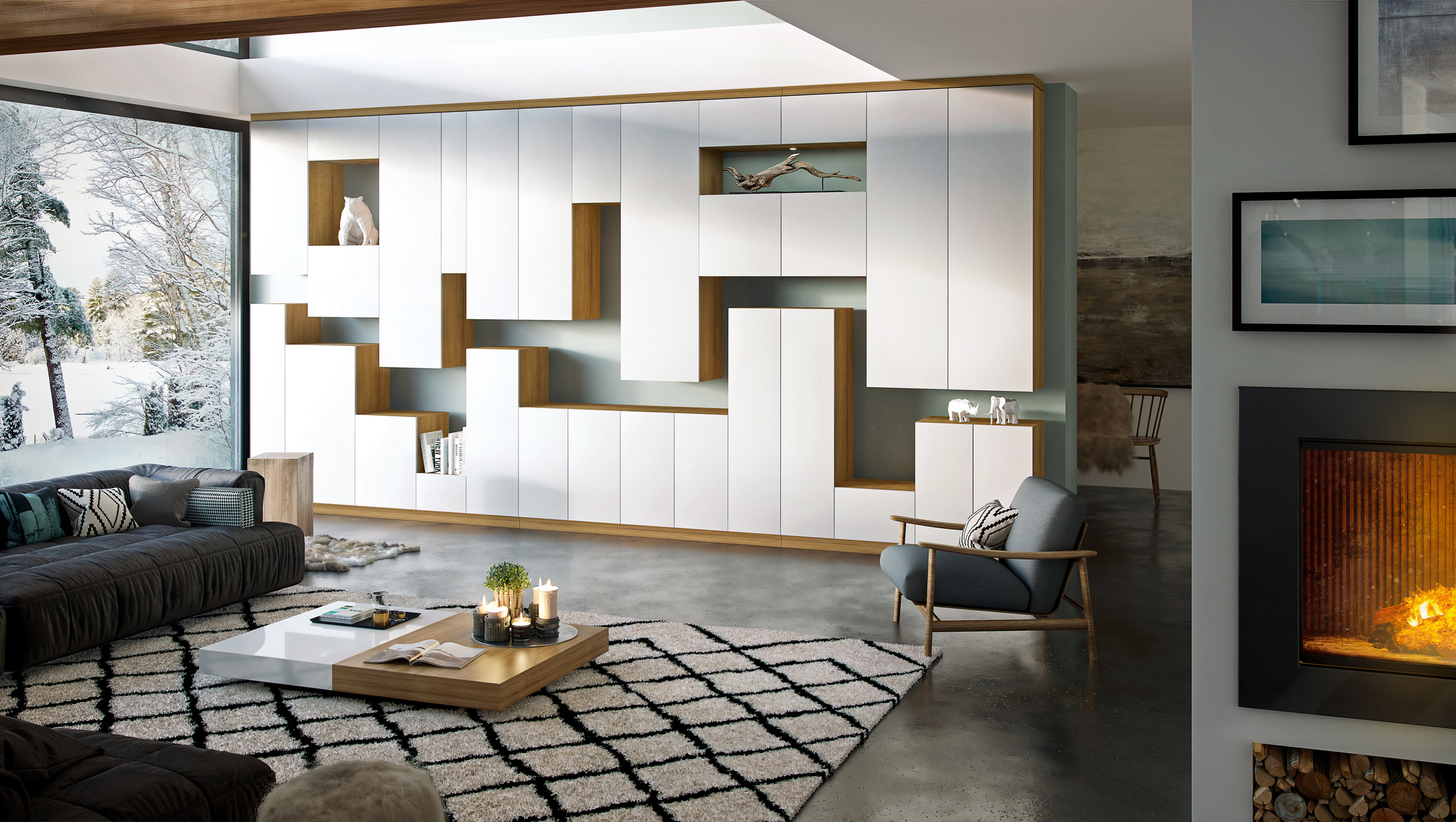 Le choix du Blanc Glossy capte toute la luminosité du salon, et son association avec le bois réchauffe naturellement l’ensemble. Cet effet bicolore blanc et bois vient sublimer la géométrie de la conception.
