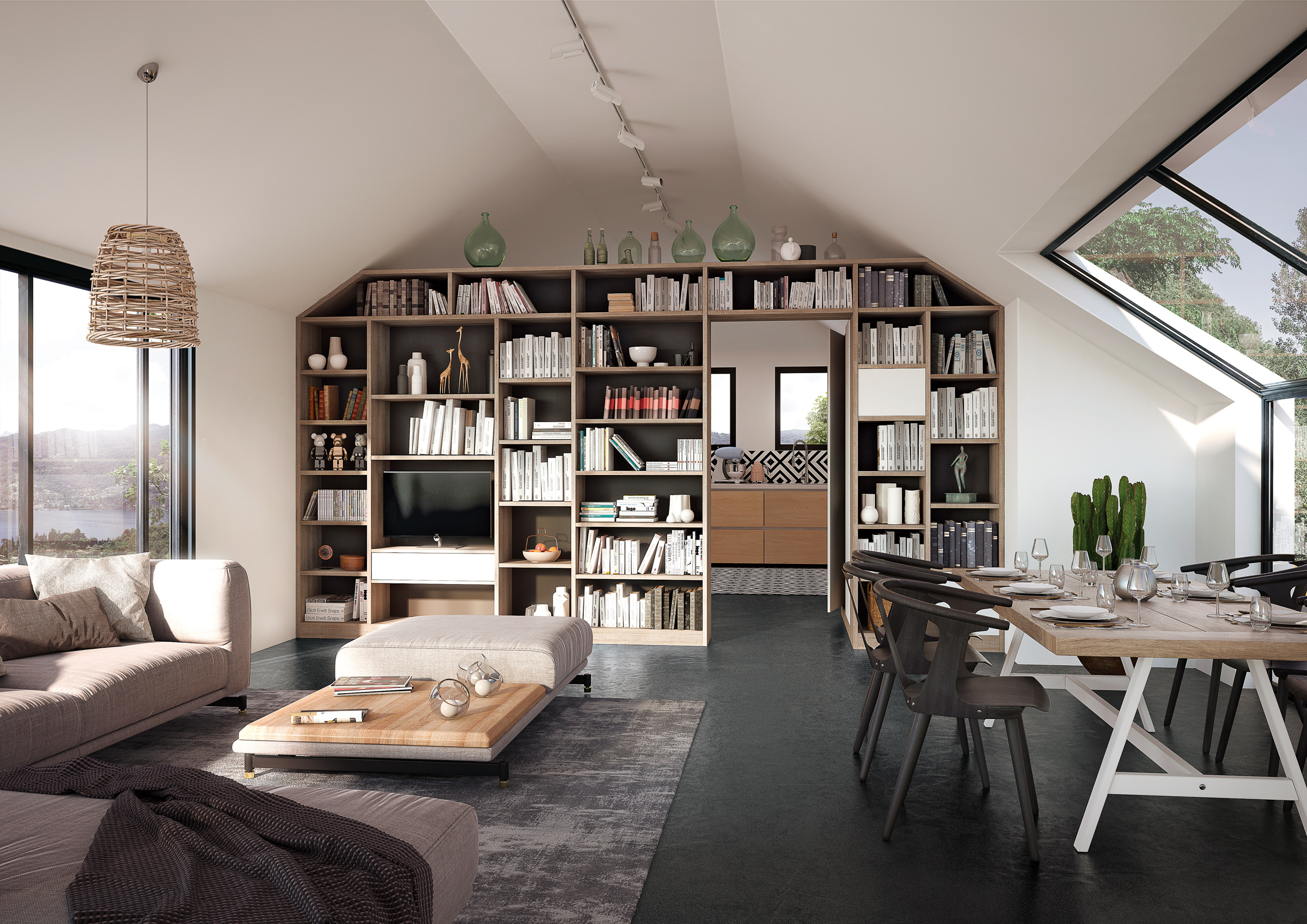 Ici, on trouve un agencement multifonction qui épouse les formes de l’espace à sa disposition. Bibliothèque, séparation, placard, ce meuble sur mesure vous permet d’exploiter efficacement vos combles tout en tirant profit des contraintes. Ce rangement soupente est personnalisé et s’adapte à la pièce. Côté salon, on y trouve des niches de différentes tailles qui vous permettront de ranger vos livres, objets de décoration mais aussi, d’y intégrer votre télévision. Côté cuisine, vous trouverez des espaces de rangements adaptés à tous vos ustensiles, casseroles etc.
